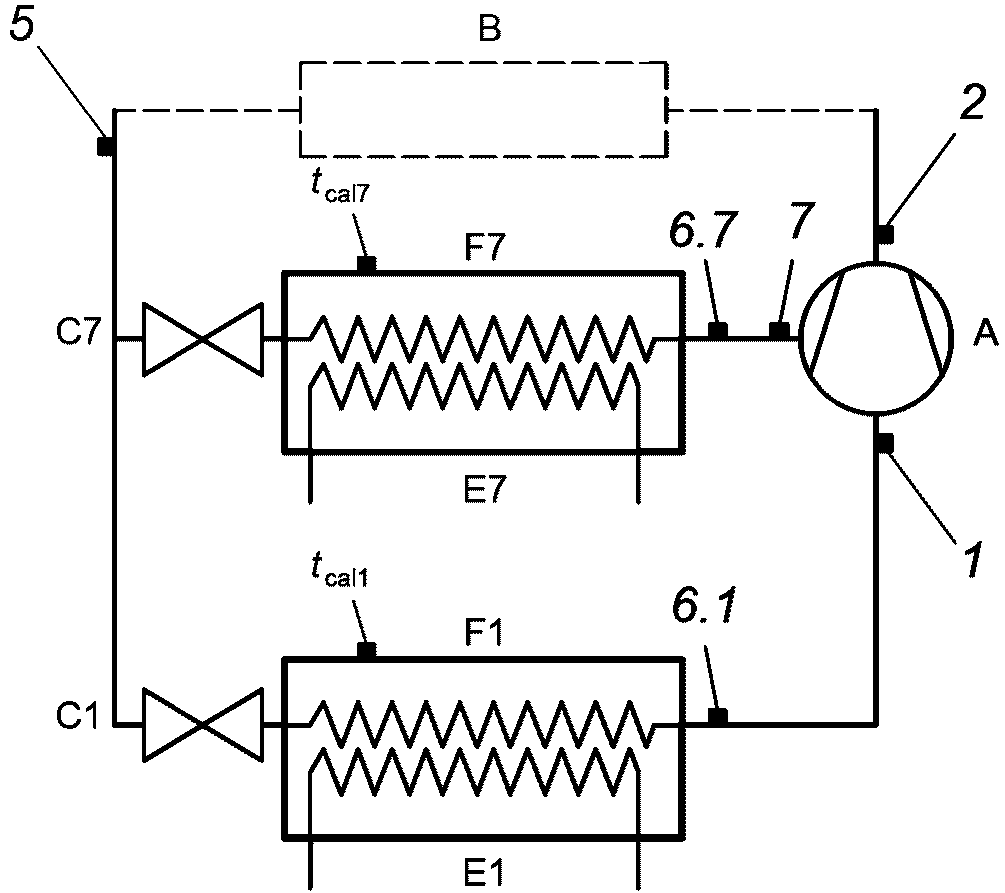 В процессе испытаний жидкость на входе в расширительное устройство C7 должна иметь переохлаждение не более 5 К относительно давления нагнетания p2 в винтовых компрессорах и не более 8 К в других компрессорах. Различие в величине переохлаждения обусловлено специфическими характеристиками различных типов компрессоров с переменным промежуточным давлением.