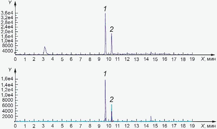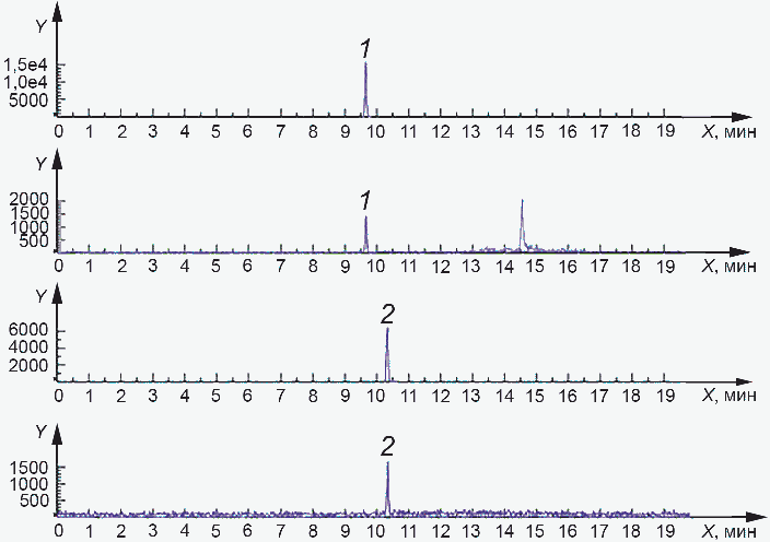 при 9,65 мин; 2 - токсин T-2 при 10,34 мин