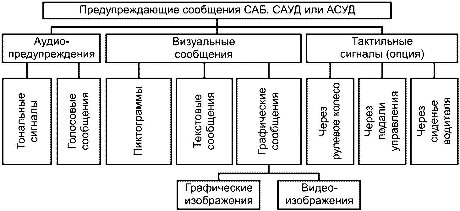 3.2 аудиопредупреждения: Предупреждающие сообщения САБ, САУД или АСУД (тональные сигналы и голосовые сообщения), предназначенные для восприятия органами слуха водителя или пользователя рассматриваемого ТС.