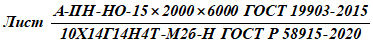 Прокат толстолистовой горячекатаный, повышенной точности изготовления по толщине (А), нормальной плоскостности (ПН), с необрезными кромками (НО), размерами 15x2000x6000 мм по ГОСТ 19903-2015, из стали марки 10Х14Г14Н4Т, с качеством поверхности группы М2б по ГОСТ 7350, нормализованный (Н) по ГОСТ Р 58915-2020
