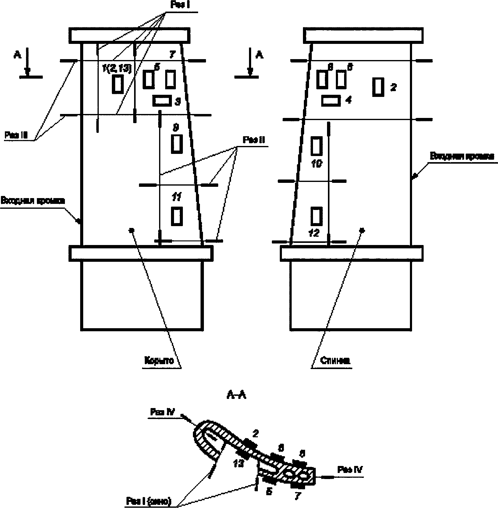 5.6.4 Пример установки тензорезисторов и разрезки литой охлаждаемой лопатки турбины при определении объемных остаточных напряжений на наружной и внутренней поверхностях профильной части приведен на