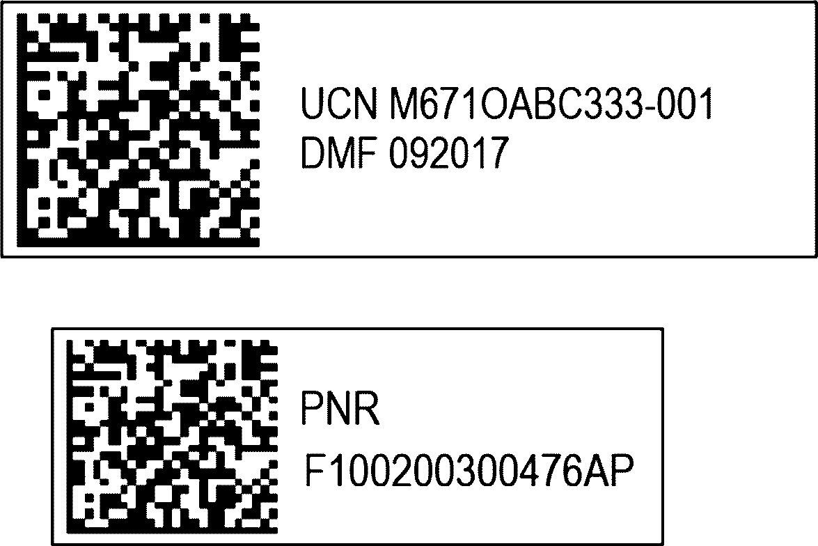 - уникальный идентификатор изделия (в буквенно-цифровой форме и машиносчитываемой форме при использовании USN, UST, UID как одного кодового слова. При фиксировании записи с раздельным указанием кода предприятия, обозначения изделия, серийного номера/номера партии данные представляются в одном символе штрихового кода, рядом с которым в буквенно-цифровой форме приводятся составляющие, причем каждая в отдельной строке после соответствующего TEI);