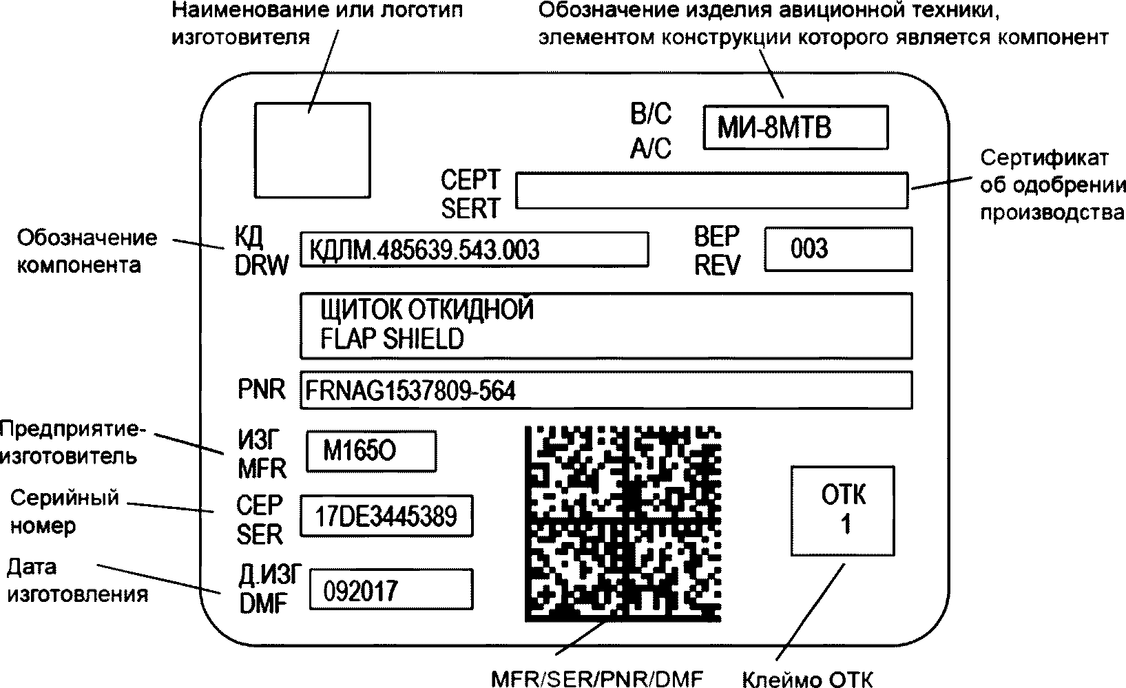 Каждый экземпляр ВС, АД, ВД, и БАС должен быть идентифицирован посредством установки на него опознавательной таблички, изготовленной из огненепроницаемого материала, с информацией, нанесенной штамповкой, гравировкой, травлением или другим методом, определенным в конструкторской документации. Опознавательная табличка и информация на ней должны быть сохранены при авиационном происшествии или инциденте.