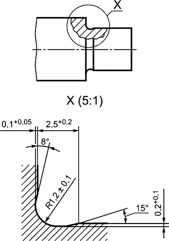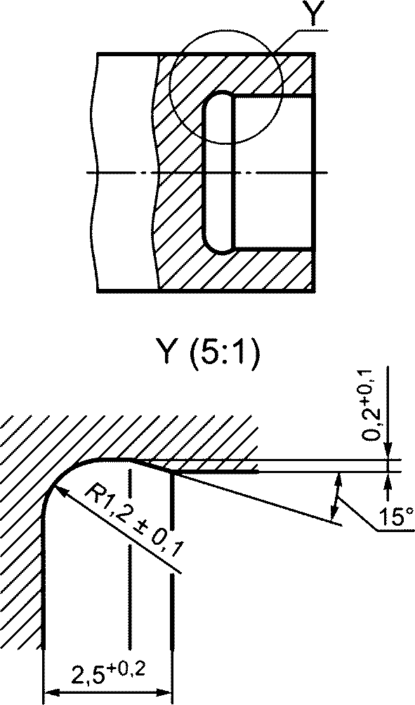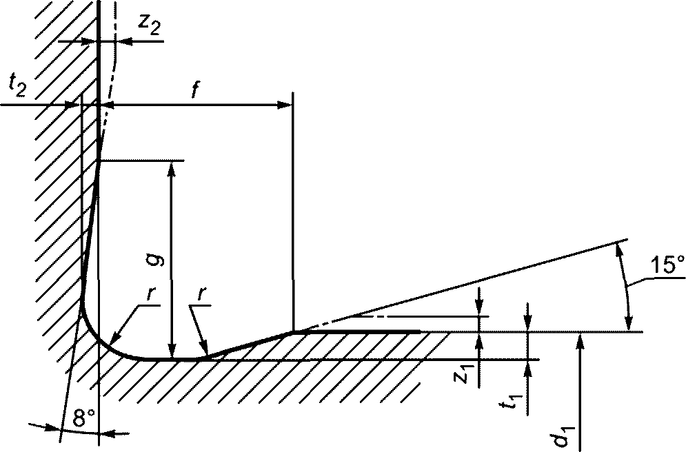 3.1 поднутрение: Удаление симметричной внутренней кромки определенной формы и заданных размеров, позволяющее, в соответствии с инструментом, используемым в производстве, обеспечить необходимое пространство для прилегающей детали во время сборки.