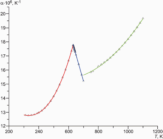 и истинного ТКЛР, а также удельного электросопротивления образцов. При составлении окончательных таблиц приведены термодинамические значения температуры, К. Температура, при которой определялся начальный размер образцов, составляла 293,15 К. Начальная температура при измерениях температурных зависимостей была, как правило, 303,15 К. Температурные зависимости