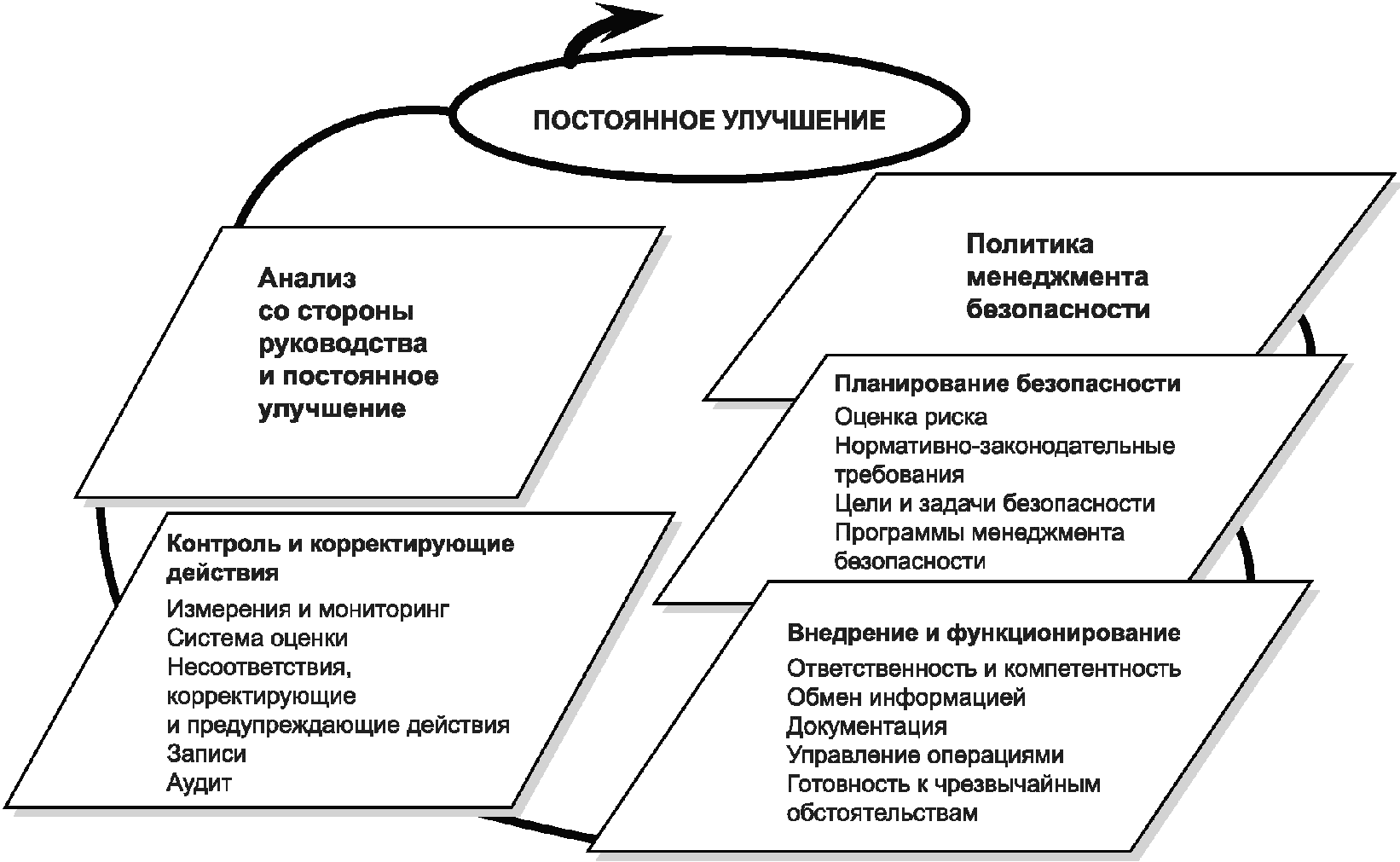 - действовать: принимать меры для постоянного улучшения результативности системы управления безопасностью.