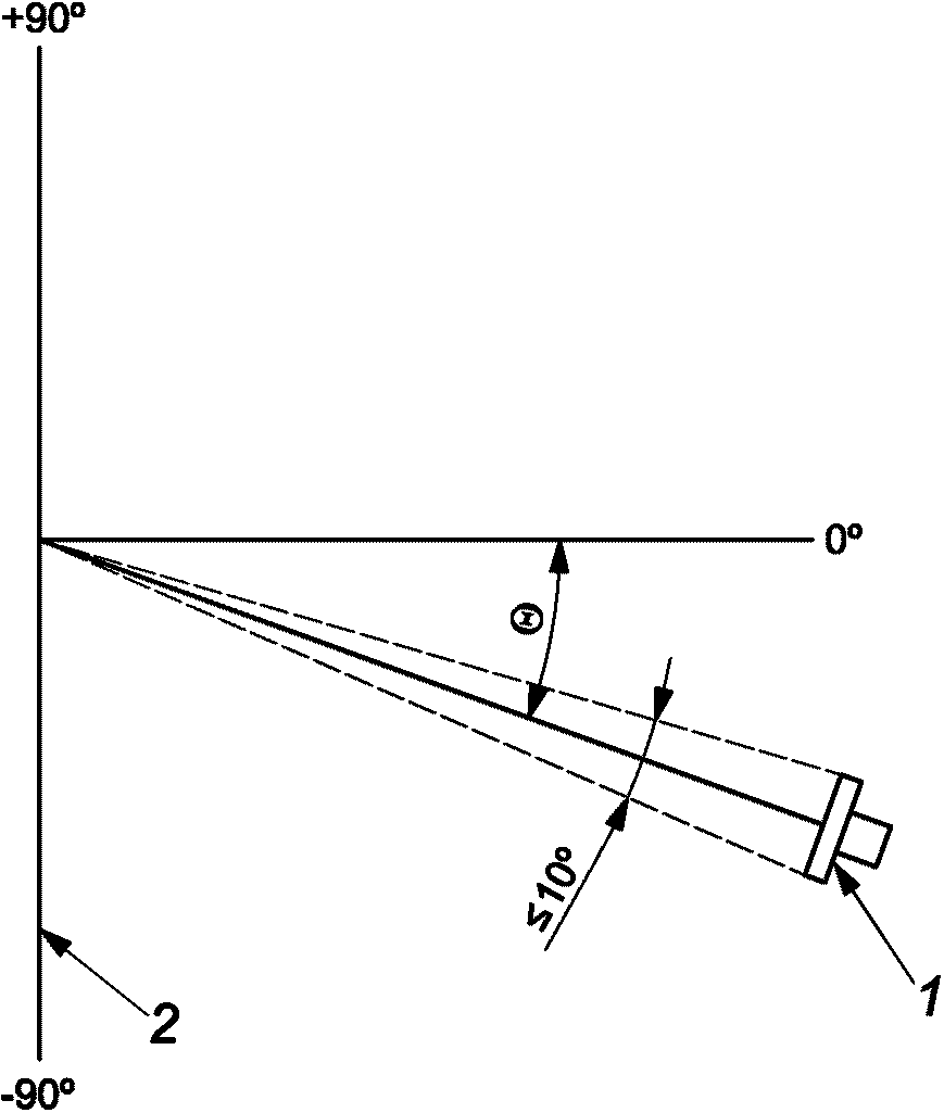 Пример 1 - Установленный в настоящем стандарте допуск на полуугол максимальной плотности потока излучения в режиме осесимметричного падающего потока составляет 45° +/- 2°, т.е. LLS = 43°, а LUS = 47°. Предположим, что расширенная неопределенность измерения полуугла конуса падающего излучения составляет +/- 1° (k = 2). В таком случае соответствие допускам можно будет считать установленным, если измеренное значение полуугла максимальной плотности потока лежит между 44° и 46°.