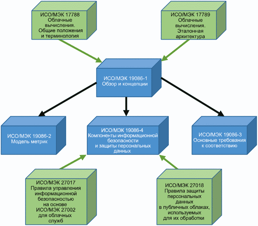 На рисунке 1 представлен обзор содержания частей ИСО/МЭК 19086 и взаимосвязей между частями ИСО/МЭК 19086 и другими ключевыми стандартами, относящимися к облачным вычислениям.