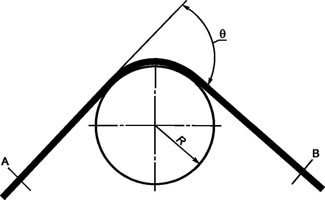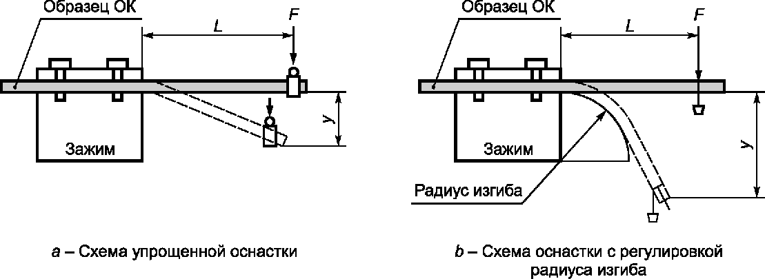 Испытательное оборудование должно обеспечивать подвеску образца ОК в конфигурации с прохождением через угол изгиба 90°. Образец должен быть натянут за счет подвески груза на вертикальном участке испытуемого образца. Диаметр углового изгиба должен жестко контролироваться, и устройство углового изгиба не должно врезаться в ОК при его натяжении. Соответствие этому требованию обеспечивается за счет применения металлического стержня или аналогичного изделия на участке изменения направления ОК. Типовая схема испытательного устройства приведена на рисунке 35.
