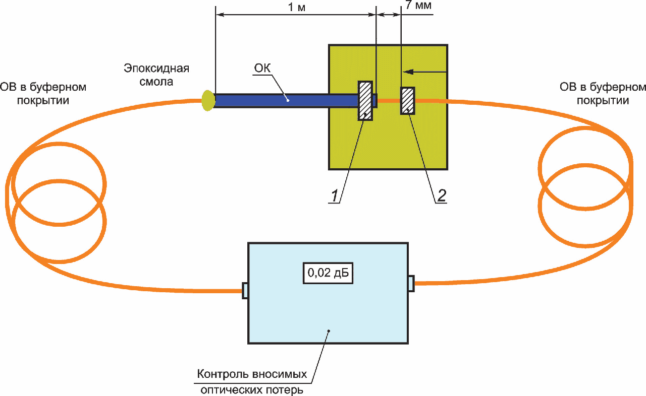 Уровень источника оптического излучения должен быть разделен через делитель оптической мощности (сплиттер) на два сигнала. Один из сигналов должен подаваться на измеритель оптической мощности и использоваться в качестве опорного значения уровня. Другой сигнал должен подаваться на конец испытуемого ОВ. Прошедший через ОВ оптический сигнал должен быть подан на 2-й измеритель оптической мощности. Все оптические разъемные соединения и сростки ОВ не должны расстыковываться в течение всего испытания.