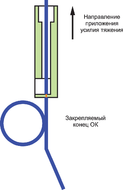 Метод подключения к обоим концам ОК - закрепляемого (фиксируемого) и конца, к которому подвешивается груз - является определяющим для успешного проведения испытания. ОК и его ОВ должны быть надежно скреплены друг с другом. Оболочка ОК не должна растягиваться или смещаться [см.
