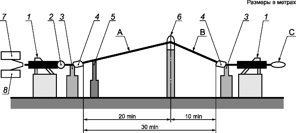 b) оборудования для испытания на растяжение, обеспечивающее размещение на нем минимальной длины ОК, подвергаемой испытанию. Для испытания на растяжение образца ОК большой длины может быть применена система роликов (см.