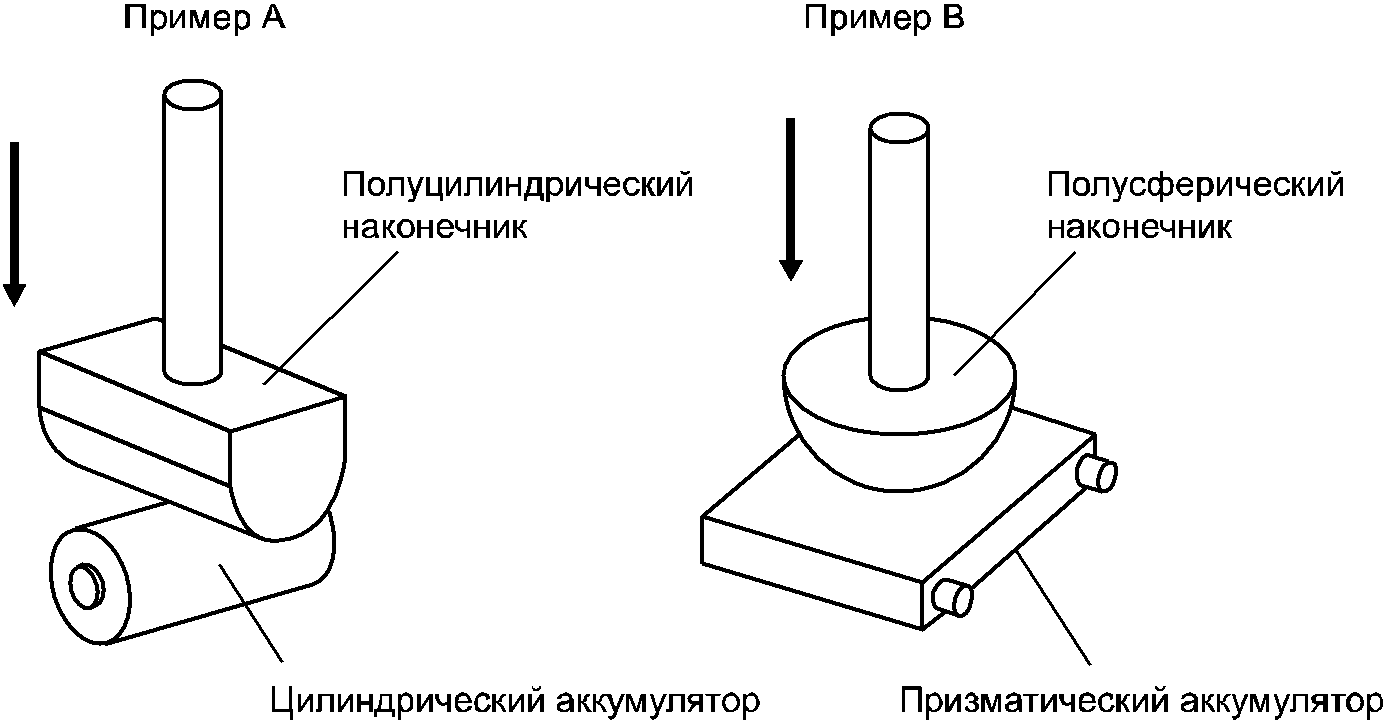 Этап 2. Аккумулятор размещают на изолированной плоской поверхности и надавливают на него сминающим инструментом с цилиндрическим/полуцилиндрическим либо сферическим/полусферическим наконечником диаметром 150 мм. Рекомендуется использовать цилиндрический наконечник для воздействия на цилиндрический аккумулятор и сферический - для призматического аккумулятора (см.