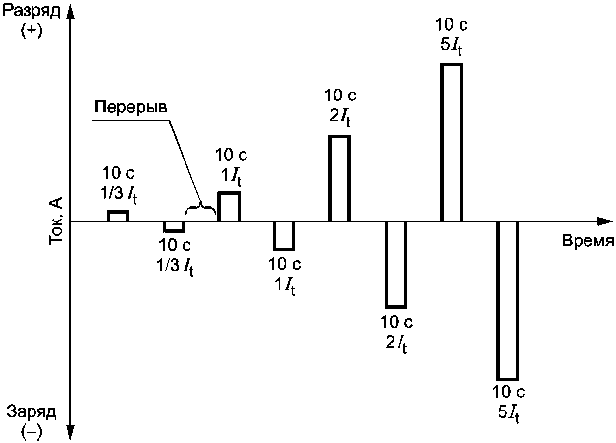 Между импульсами заряда и разряда, импульсами разряда и заряда должен быть предусмотрен перерыв продолжительностью 10 мин. Если температура аккумулятора через 10 мин отличается от температуры испытаний более чем на 2 °C, то время перерыва продлевают до тех пор, пока температура аккумулятора не достигнет требуемого значения с отклонением не более чем на 2 °C. После этого испытания продолжают.
