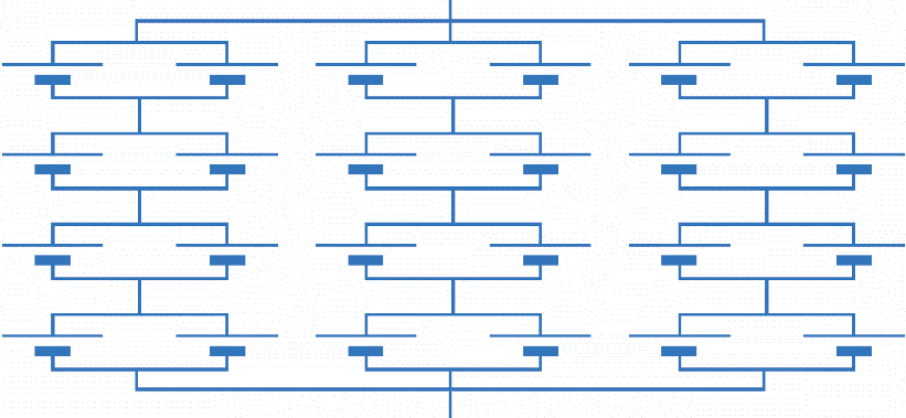 рисунке A.5 изображена архитектура построения батареи, представляющая собой соединенные параллельно три цепочки, каждая из которых состоит из соединенных последовательно четырех цепочек по два аккумулятора, соединенных параллельно.