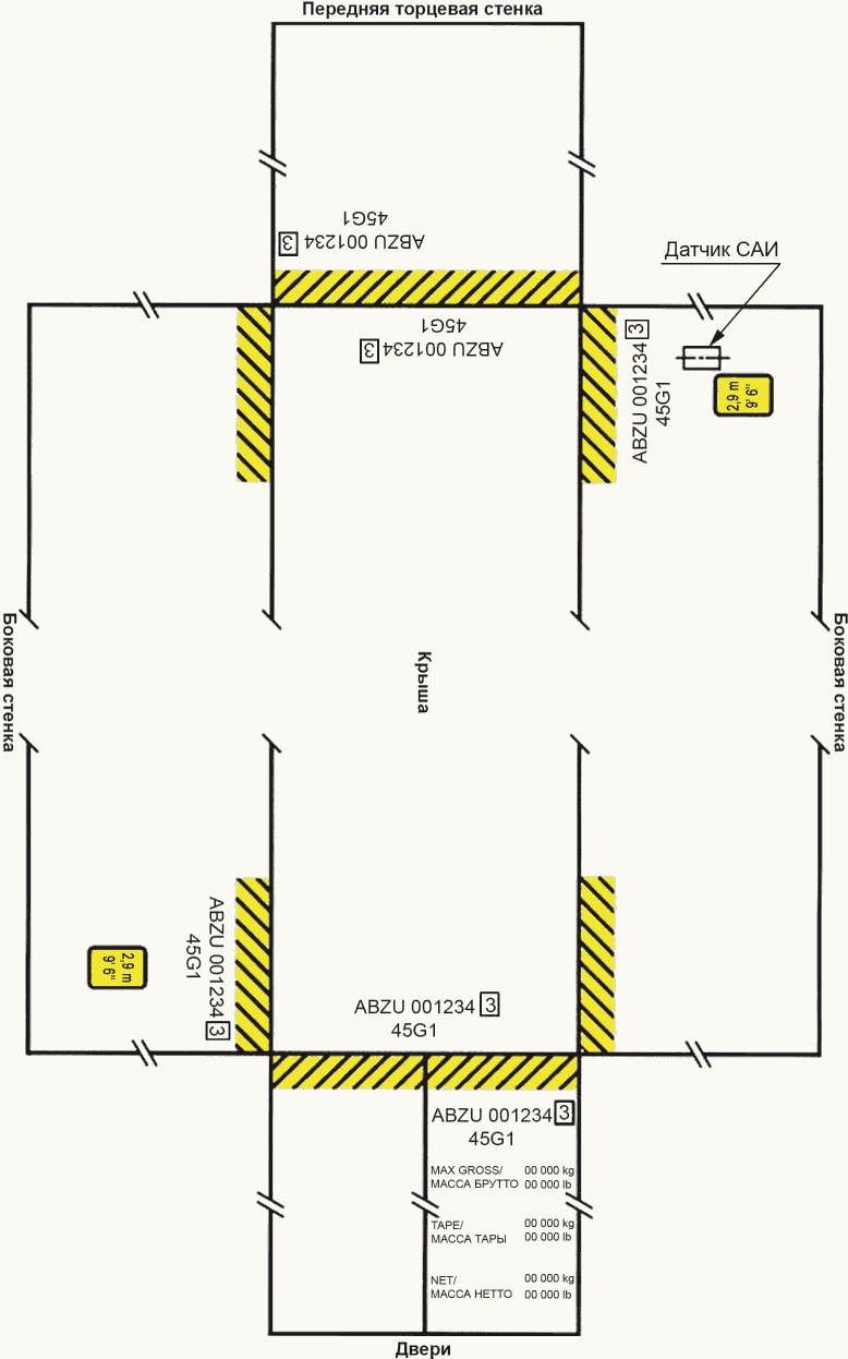 Знак располагают на каждом контейнере в двух местах: около правого края каждой стороны на расстоянии не более 1,2 м (4 фута) от крыши контейнера и в пределах 0,6 м (2 фута) от правого края ниже идентификационного номера контейнера.