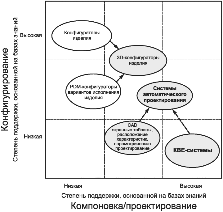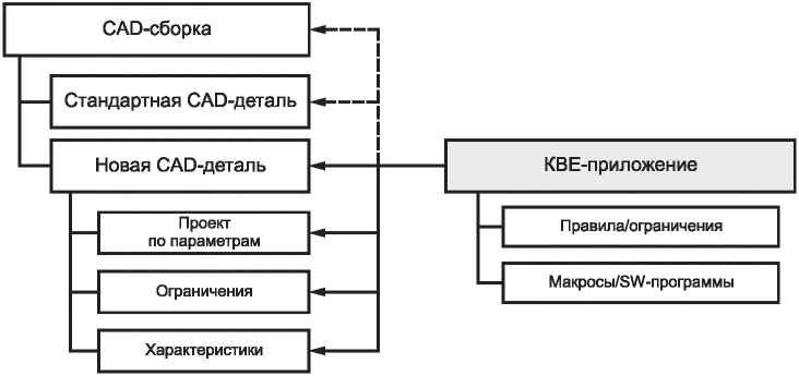 Конфигуратор продукции, основанный на ограничениях, в KBE-приложении рассматривают в качестве основы, что позволяет создавать модели CAD-системы с коммерческим параметрическим ядром моделирования. CAD-система и KBE-приложение связаны с PDM-системой с помощью интерфейсов, которые способны обмениваться данными в XML-формате.