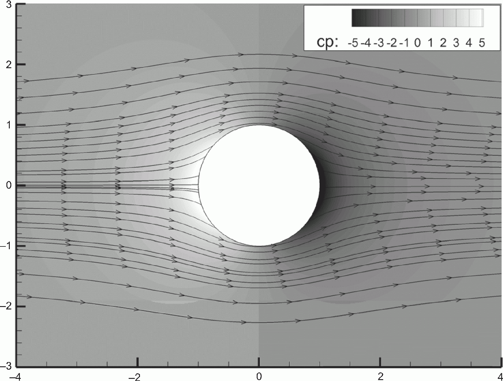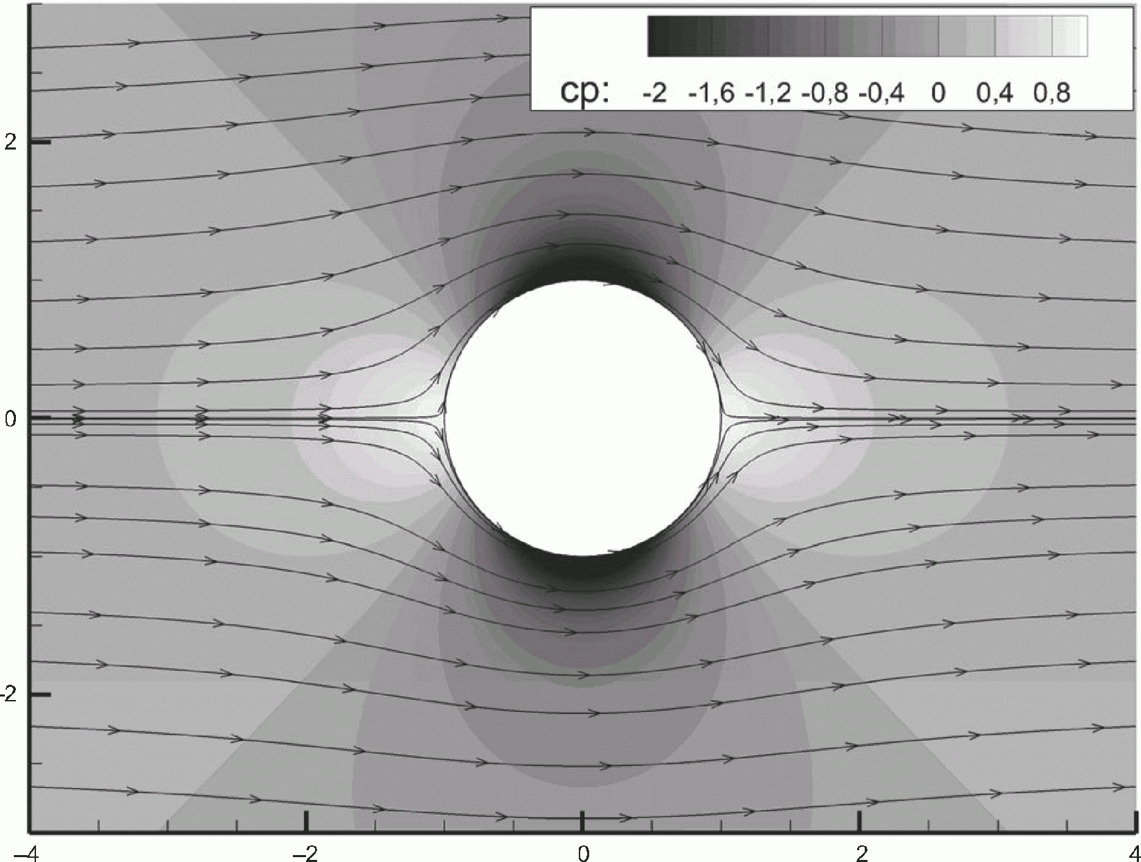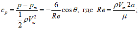 При сопоставлении результатов численного моделирования с представленным решением надо учитывать, что рассматриваемое аналитическое решение по отношению к реальным вязким течениям адекватно только на наветренной стороне цилиндра. Соответственно, если в численном моделировании используется модель невязкой жидкости, то результаты численного моделирования и аналитического решения должны совпадать во всей области течения. Если используется модель вязкой жидкости (числа Рейнольдса Re = 103 и выше), то результаты должны соответствовать только на наветренной стороне.