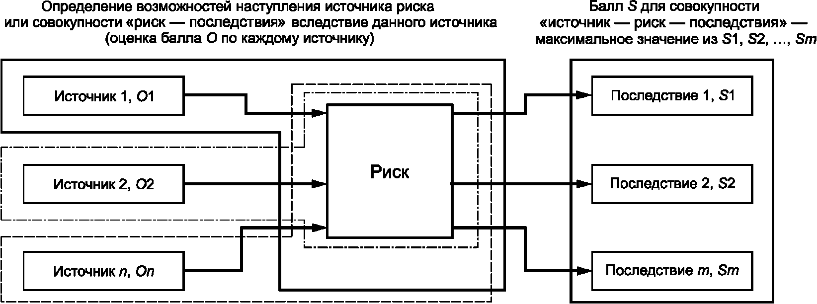 Г.3.2 В качестве балла S для совокупности "источник - риск - последствия" следует выбирать максимальный балл из всех оценок последствий рассматриваемого риска (см. рисунок Г.2).