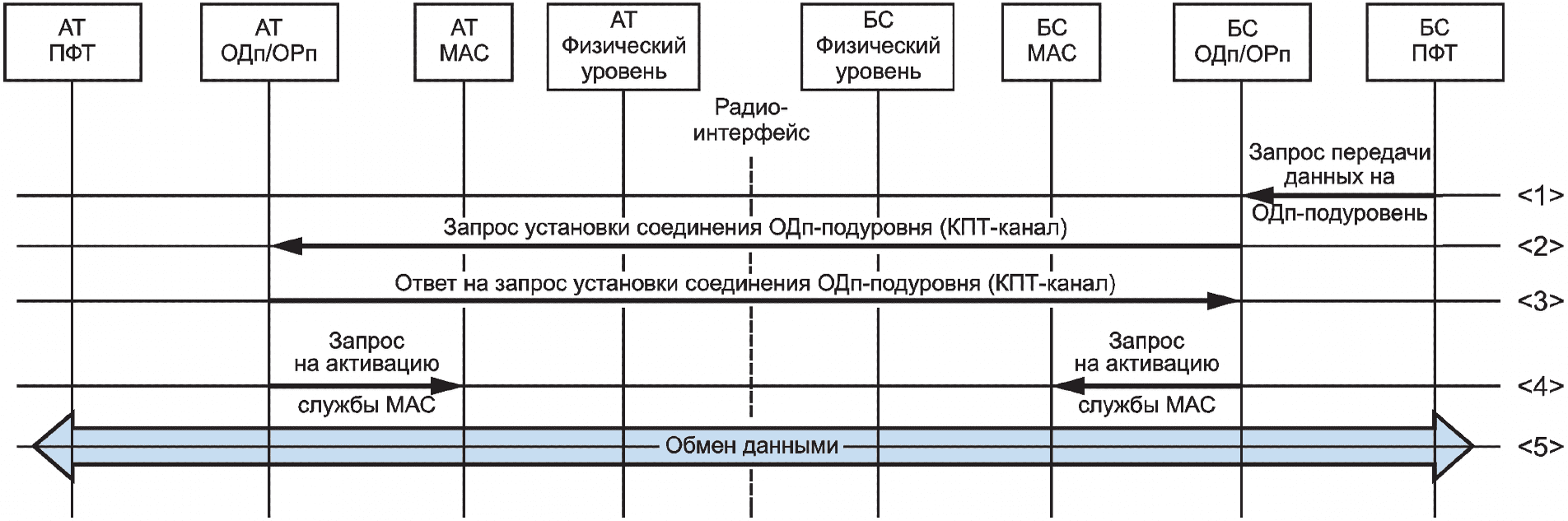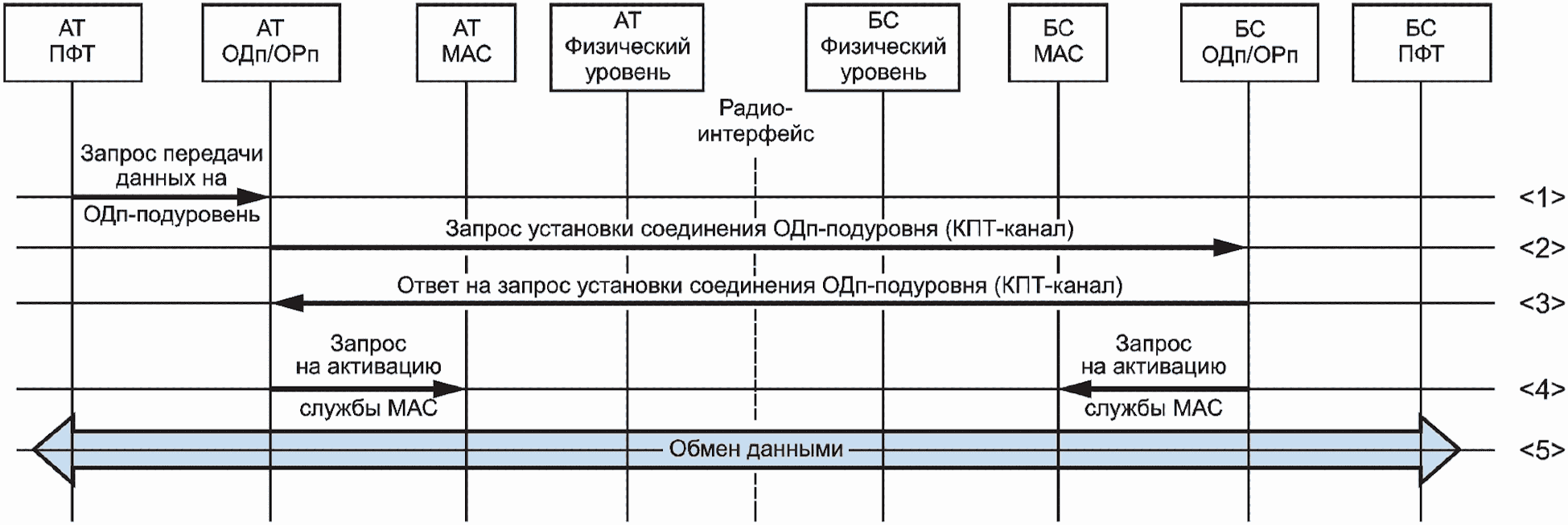 АТ/БС | TОДп_УСТ | Интервал времени, в течение которого АТ/БС после передачи сообщения "Запрос установки соединения ОДп-подуровня" ожидает ответа | 12 кадров |