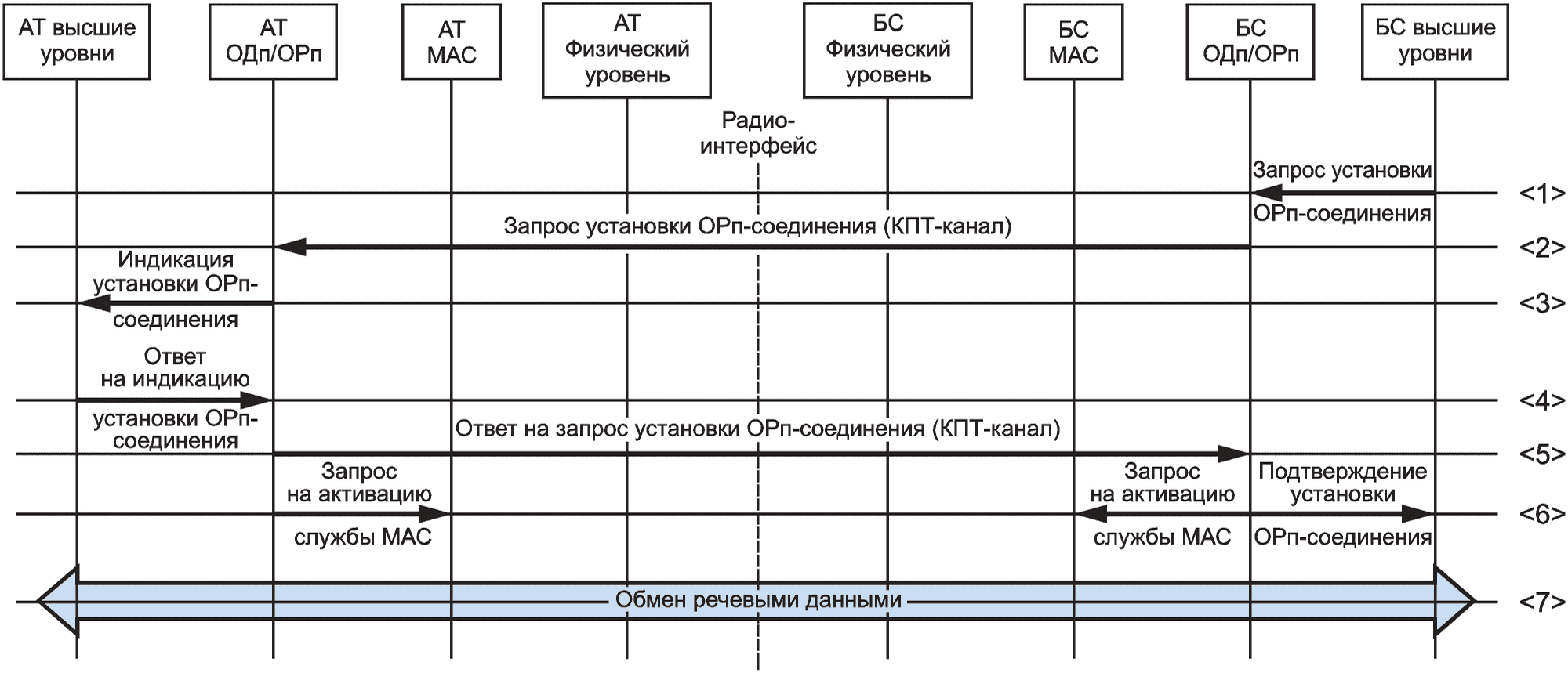 АТ/БС | TОРп_УСТ | Интервал времени, в течение которого АТ/БС после передачи сообщения "Запрос установки ОРп-соединения" ожидает ответа | 12 кадров |