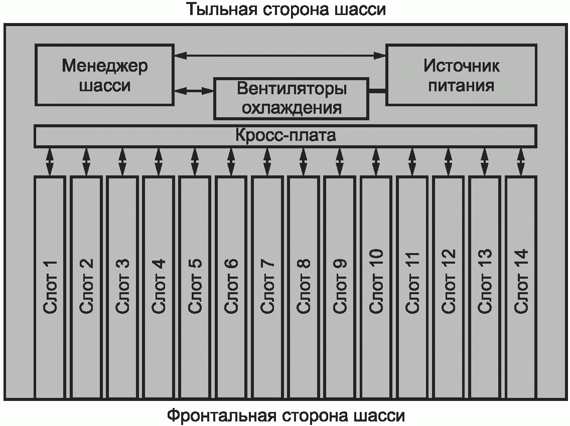 рисунке 2. Модули AXIe устанавливают в слоты фронтального носителя модулей шасси и подключают к разъемам кросс-платы. Кросс-плата обеспечивает трассировку цепей питания и сигналов системного управления к инструментальным модулям, а также сигналов данных, частот и триггерных сигналов между инструментальными модулями. Менеджер шасси является выделенным контроллером управления системой, который отслеживает исправность подсистем шасси и модулей, управляет системой охлаждения и последовательностью включения питания шасси. В модулях могут быть реализованы любые функции, необходимые для проведения тестирования/измерений, например: измерение и анализ сигналов, формирование сигналов, ввод/вывод цифровых сигналов, организация потоков данных, компьютерные вычисления и многое другое.