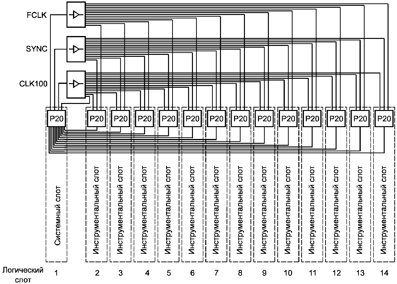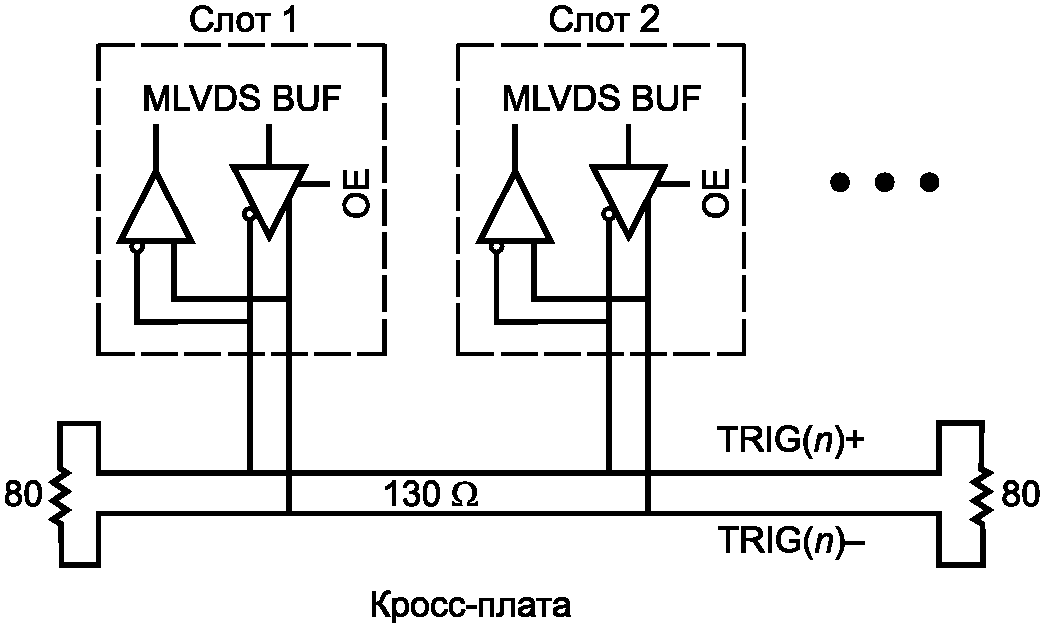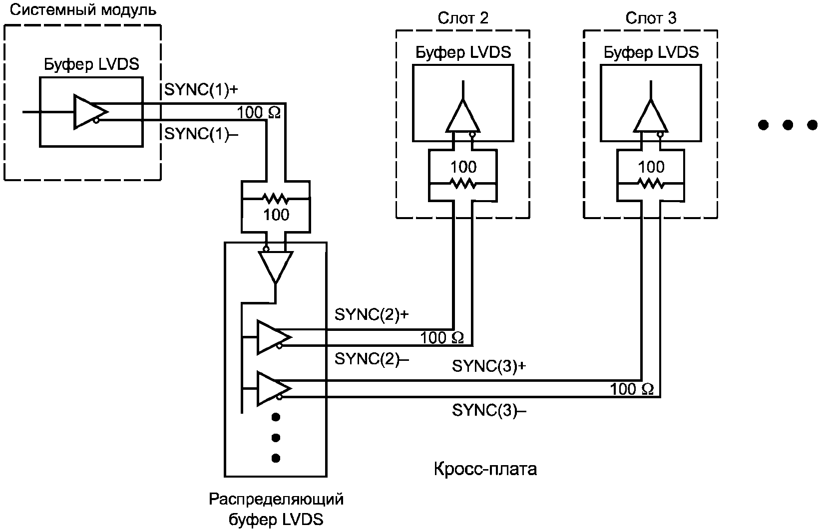 [1]. Кросс-платы AXIe поддерживают шинную топологию сигналов интерфейса частот синхронизации. Устройства AXIe, как и устройства ATCA, используют уровни MLVDS для линий. Однако шина использована модулями AXIe для синхронизации и транспортирования сигналов запуска общего назначения. Системы AXIe, как правило, не предоставляют специфических сигналов частоты синхронизации, определенных в