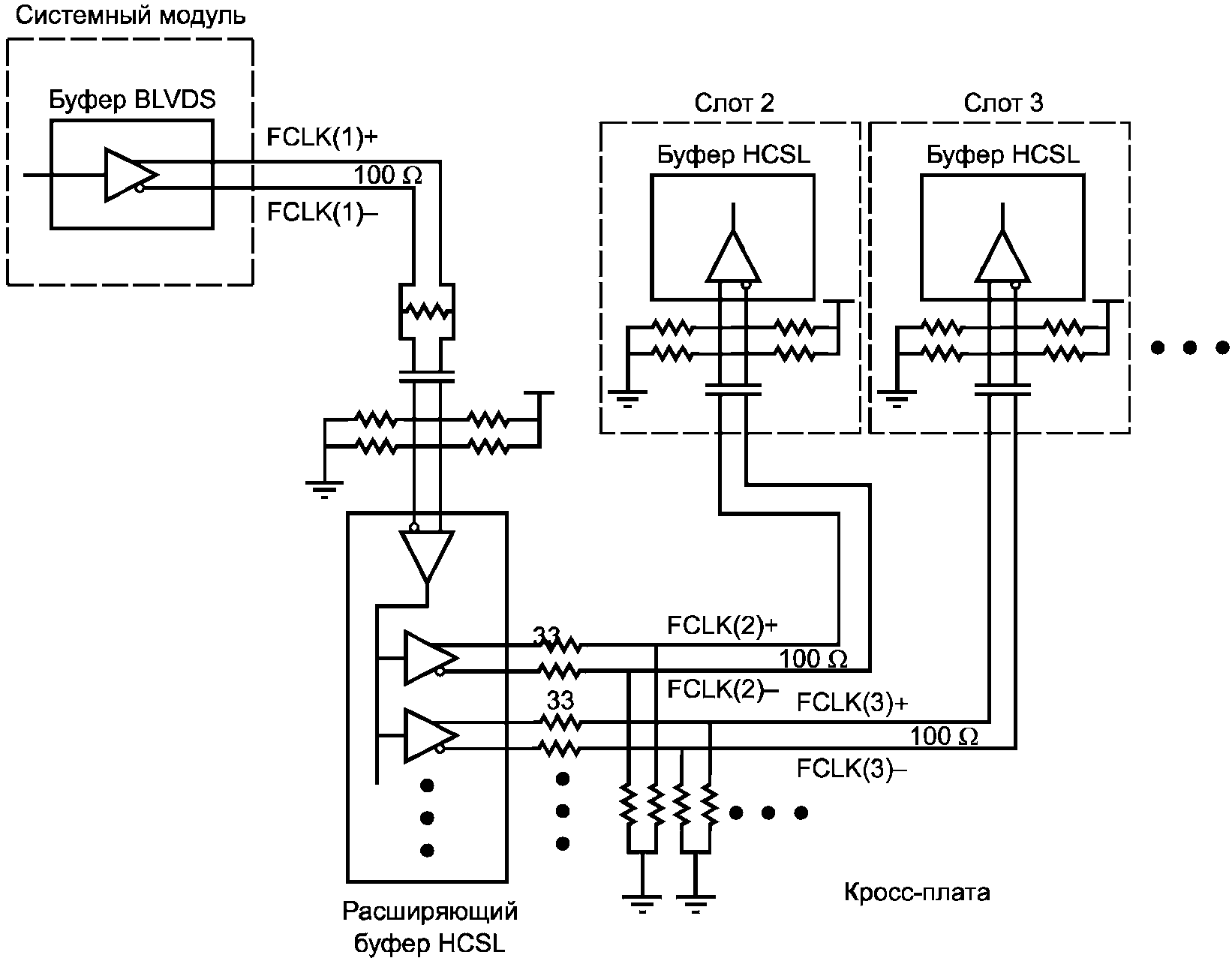 [1]. Модули и системы могут выборочно реализовывать схемы дополнительного питания. Не требуется использование шины управления дополнительным питанием. На кросс-плате отсутствует трассировка линий каналов base и fabric ко второму концентратору системы.