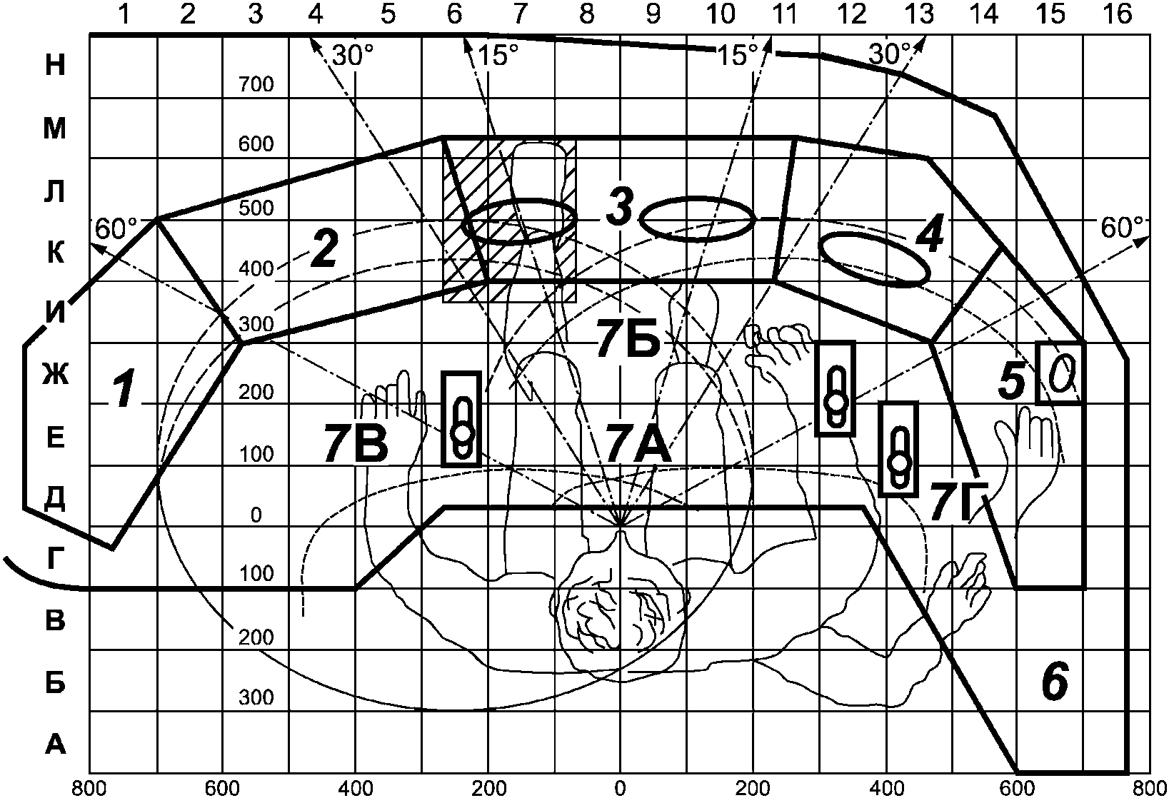 7.10 На моторной панели пульта управления в зонах 7Б, 7В и 7Г и частично в зоне 6 должно быть размещено минимально необходимое, но достаточное (исходя из логики работы машиниста в штатных и аварийных ситуациях) число ОУ для управления движением ТПС.