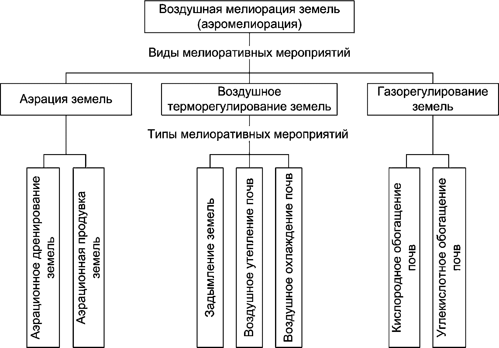 2.11 воздушная мелиорация земель [аэромелиорация]: Тип мелиорации земель, осуществляемый посредством газов или воздуха с целью регулирования воздушно-газового режима почв.