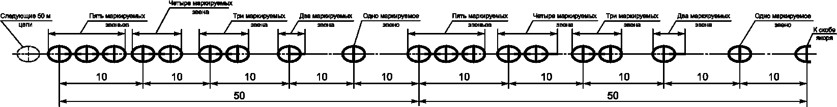 5.1 Знаки маркировки якорной цепи по схеме типа 1 должны быть повторяющимися через каждые 50 м с интервалом 10 м, начиная от якорной скобы, в соответствии с