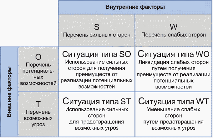 SWOT - анализ слабых и сильных сторон компании, потенциальных возможностей и угроз (strength - weakness - opportunities - threats).