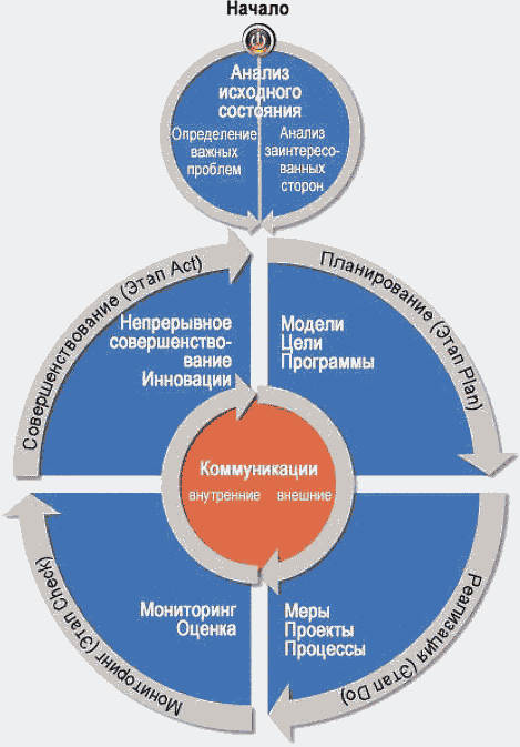 При этом могут оказаться полезными организационные структуры и системы, уже существующие в компании (например, имеющие отношение к охране окружающей среды, охране труда или менеджменту качества продукции). Существующие направления деятельности и текущие мероприятия по достижению устойчивости компании необходимо скорректировать в соответствии с новыми намеченными комплексными целями. PDCA-цикл (см.