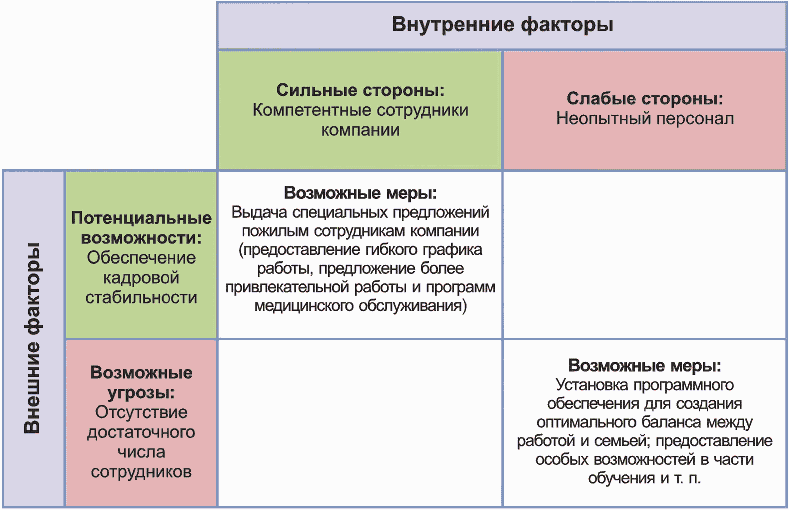 Сотрудники компании | Демографические изменения | Повышение привлекательности для заказчиков; привлечение более молодых сотрудников; увеличение рабочего стажа и/или снижение текучести кадров | Введение интенсивного маркетинга персонала, например путем рекламы в школах и высших учебных заведениях; введение новых мест для стажеров и практикантов; продолжение разработки мер по повышению кадровой стабильности |