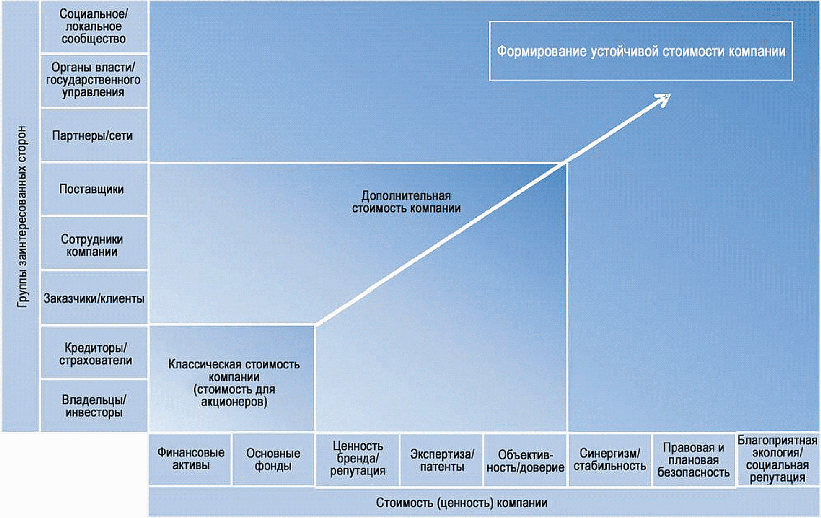 Участие в деятельности компании таких групп заинтересованных сторон как владельцы, поставщики финансовых услуг, поставщики продукции, сотрудники, клиенты, партнеры, органы исполнительной власти и местное сообщество, обеспечивает повышение ее результативности и стабильность, но при условии соблюдения ею правовых норм, социальных обязательств и учета экологических аспектов (см.