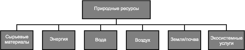 Примечание - Природные ресурсы включают: восстанавливаемые и невосстанавливаемые исходные сырьевые материалы, физическое пространство (поверхность), ресурсы, связанные с потоками материи (геотермические источники энергии, ветер, приливы, солнечную энергию), а также экологические среды (воду, почву, воздух) и экосистемы.