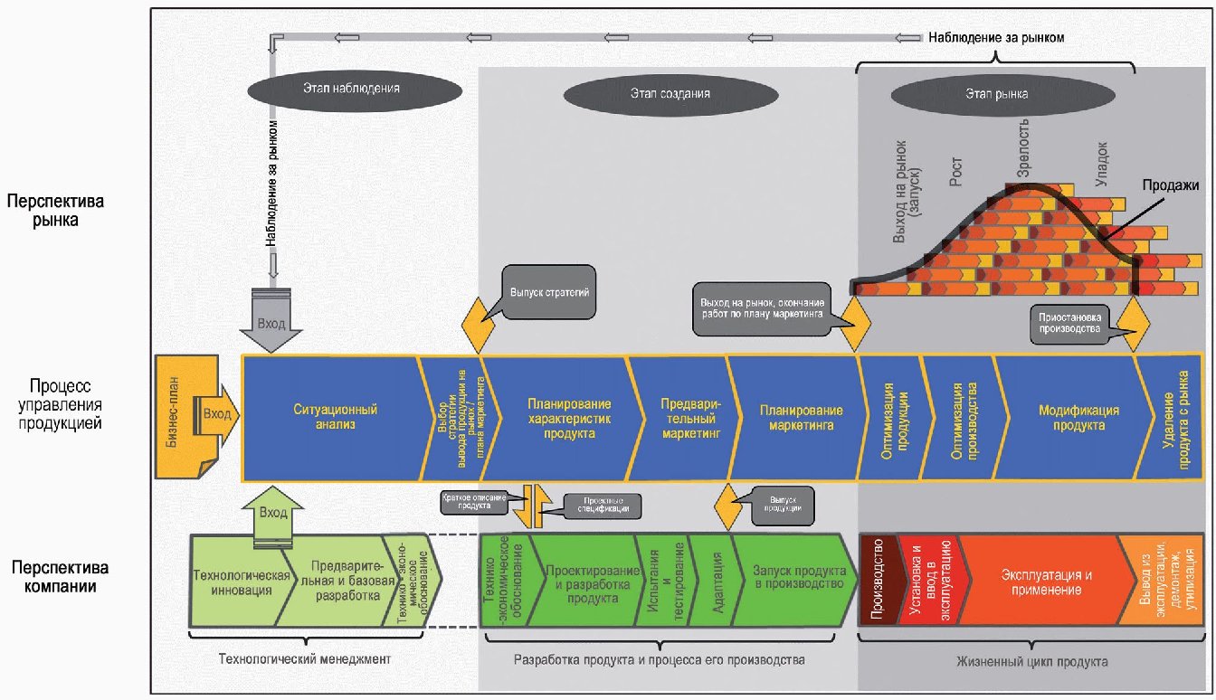 В настоящем стандарте предложен целостный процесс управления продукцией, включающий все необходимые и связанные с ней решения и задачи, соответствующие этапам ее жизненного цикла. В отличие от маркетинга жизненный цикл продукции не ограничивается рассмотрением лишь рыночной фазы. Полный жизненный цикл продукции (в контексте настоящего стандарта) охватывает все без исключения этапы, связанные с ней как внутри компании, так и вне ее, начиная от этапа выработки исходной идеи продукта и заканчивая этапом окончательного удаления продукта с рынка. Целостное описание процесса управления продукцией охватывает все важные области взаимодействия управления продукцией как внутри компании, так и вне ее, а также содержит анализ множества различных функций (ролей), которые ответственный за процесс менеджер по продукции должен выполнять на том или ином этапе жизненного цикла продукта.