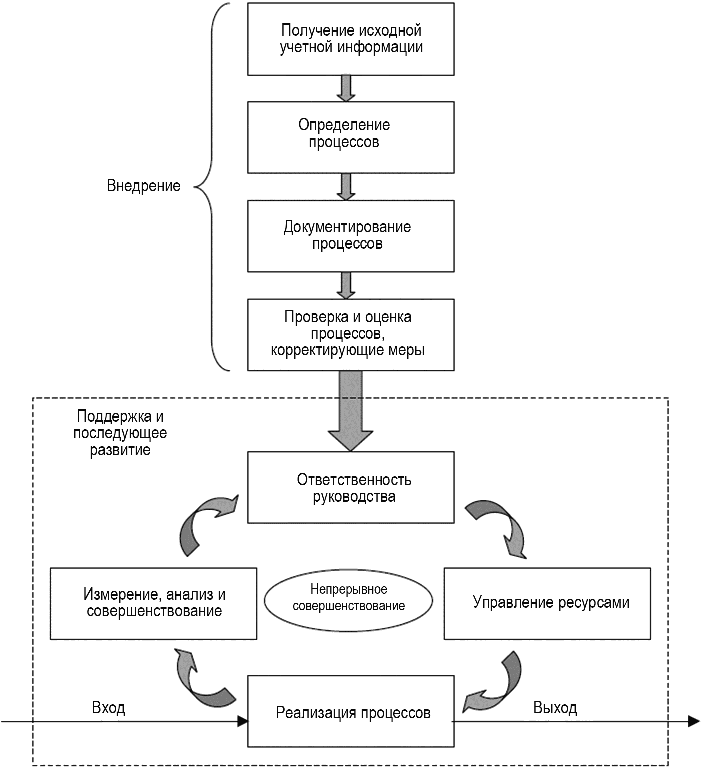 ГОСТ Р ИСО 14001, а также других стандартов на системы менеджмента представляется целесообразным при выборе структуры IMS-системы использовать их базовую структуру в качестве основы. Использование методов и средств, ориентированных на процессы, подразумевает описание процессов (процессное управление), посредством которых создается добавленная стоимость, т.е. производственных и вспомогательных процессов.