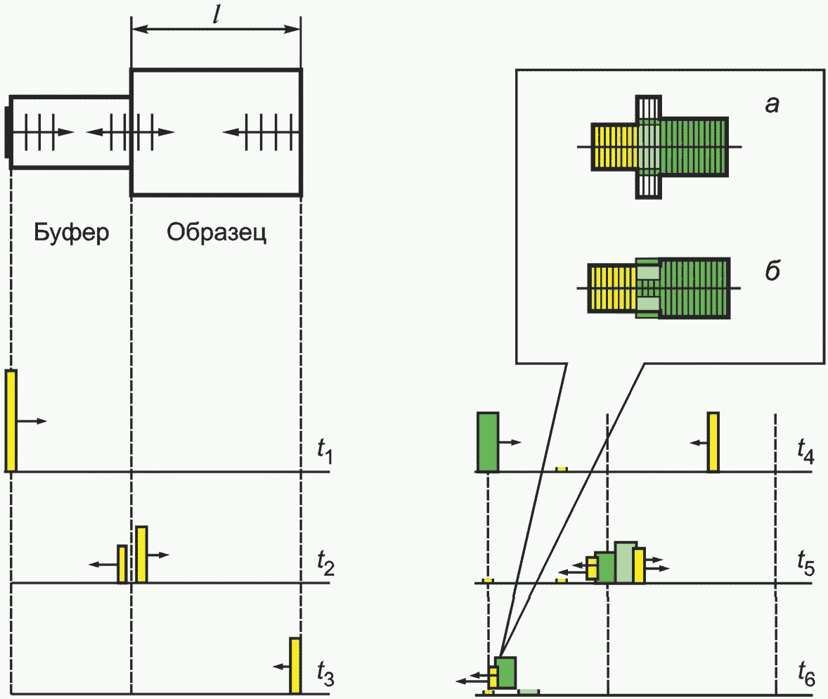 Длительность акустических импульсов должна быть по меньшей мере в два раза меньше, чем время пробега ультразвука по кристаллу, а период следования серии ультразвуковых импульсов должен быть много больше, чем период полного прохода ультразвука по системе буфер - кристалл.