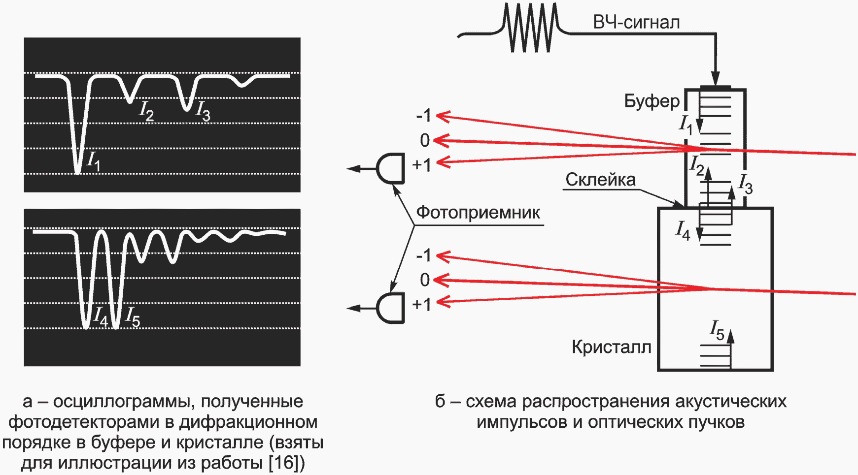 Измерения заключаются в регистрации эффекта дифракции светового пучка на акустическом импульсе, возбуждаемом пьезопреобразователем и распространяющемся последовательно в буфере и кристалле. В соответствии с формулой амплитуда сигнала, регистрируемого фотоприемником в +1 или в -1 порядках дифракции, прямо пропорциональна мощности соответствующего ультразвукового импульса и коэффициенту АО качества
