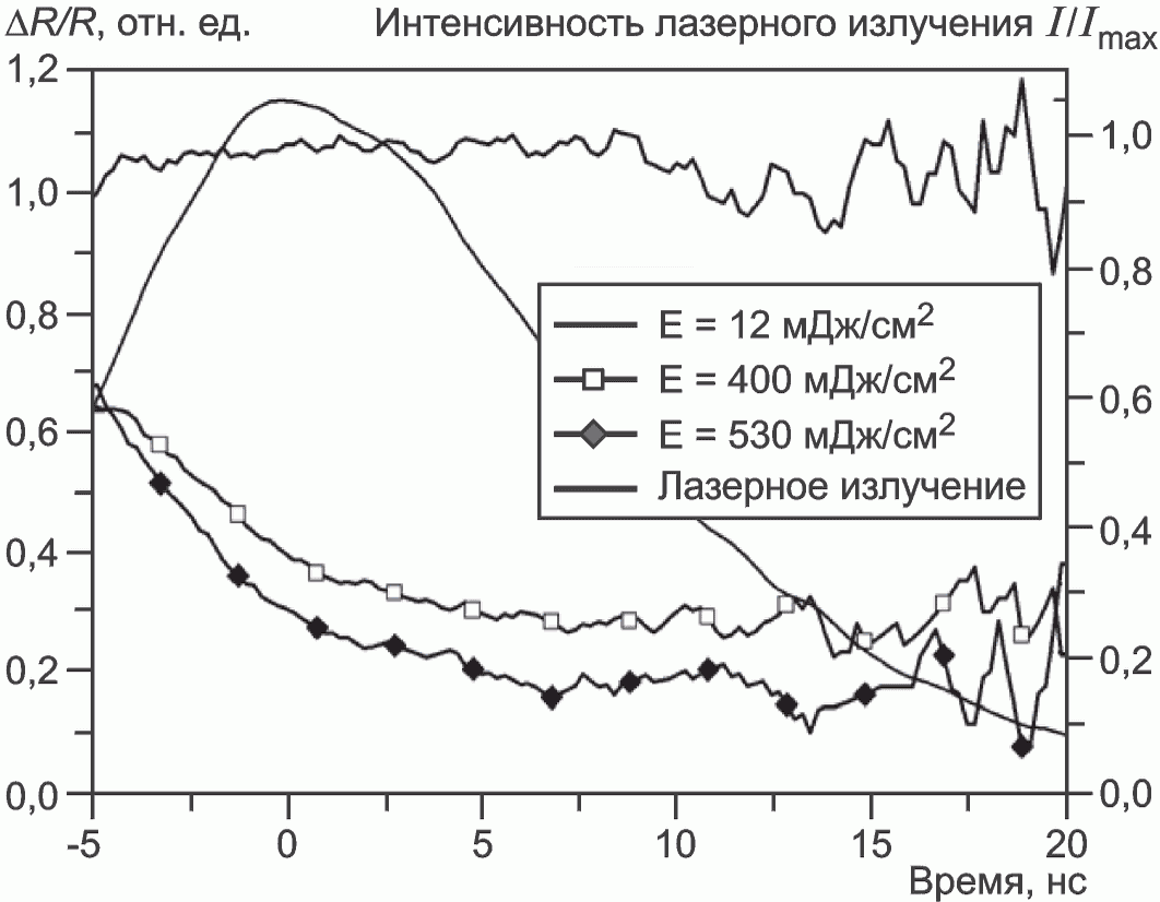 рисунке А.6 представлена динамика изменения отражательной способности поверхности образца. При относительно высокой плотности энергии лазерного импульса ~ 120 мДж/см