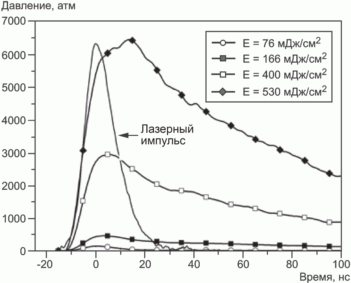 Измерение падающего, отраженного, теплового излучения и сигнала калиброванного пьезоприемника, с помощью которого измеряется давление, осуществляется с наносекундным временным разрешением.