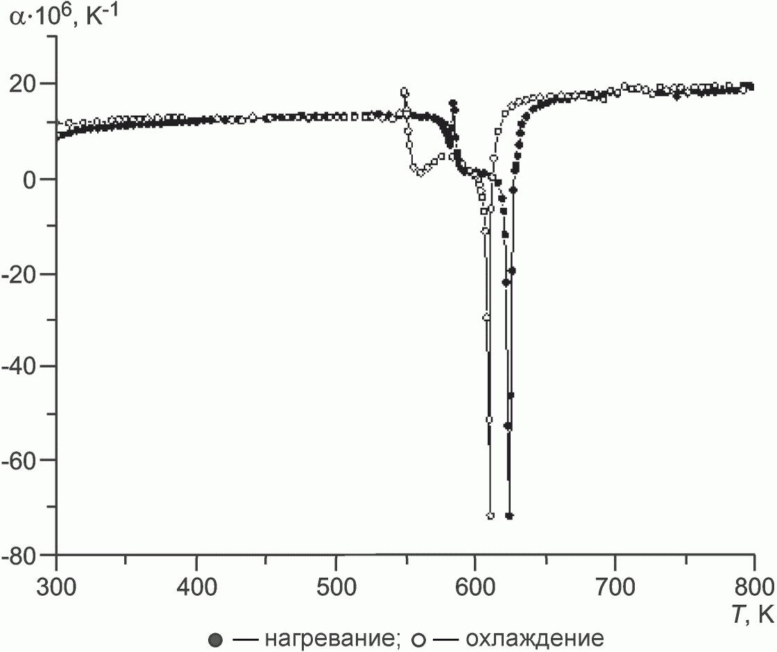От 300 К до 550 К ТКЛР практически не изменяется (инварный эффект). Далее наблюдается резкое уменьшение ТКЛР с минимумом при 623 К ("гигантское" отрицательное значение ~ до минус 85·10-6, К-1). Это связано с сжатием кристаллической структуры от тетрагональной к псевдокубической структуре. При обратном ходе температура минимума смещается в сторону низкой температуры приблизительно на 5 К.