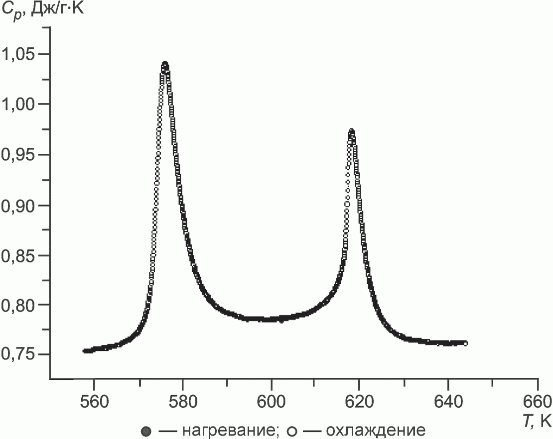 При температурах выше 565 К наблюдается резкий рост Cp с пиком при 576 К (1039 Дж/кг·К), связанный со структурным изменением [(содержание ромбической (Р) и ромбоэдрической (Рэ) фаз)]. Далее резкое уменьшение до 509 К, где происходит уменьшение фаз Рэ и Р и частичный переход к тетрагональной структуре.
