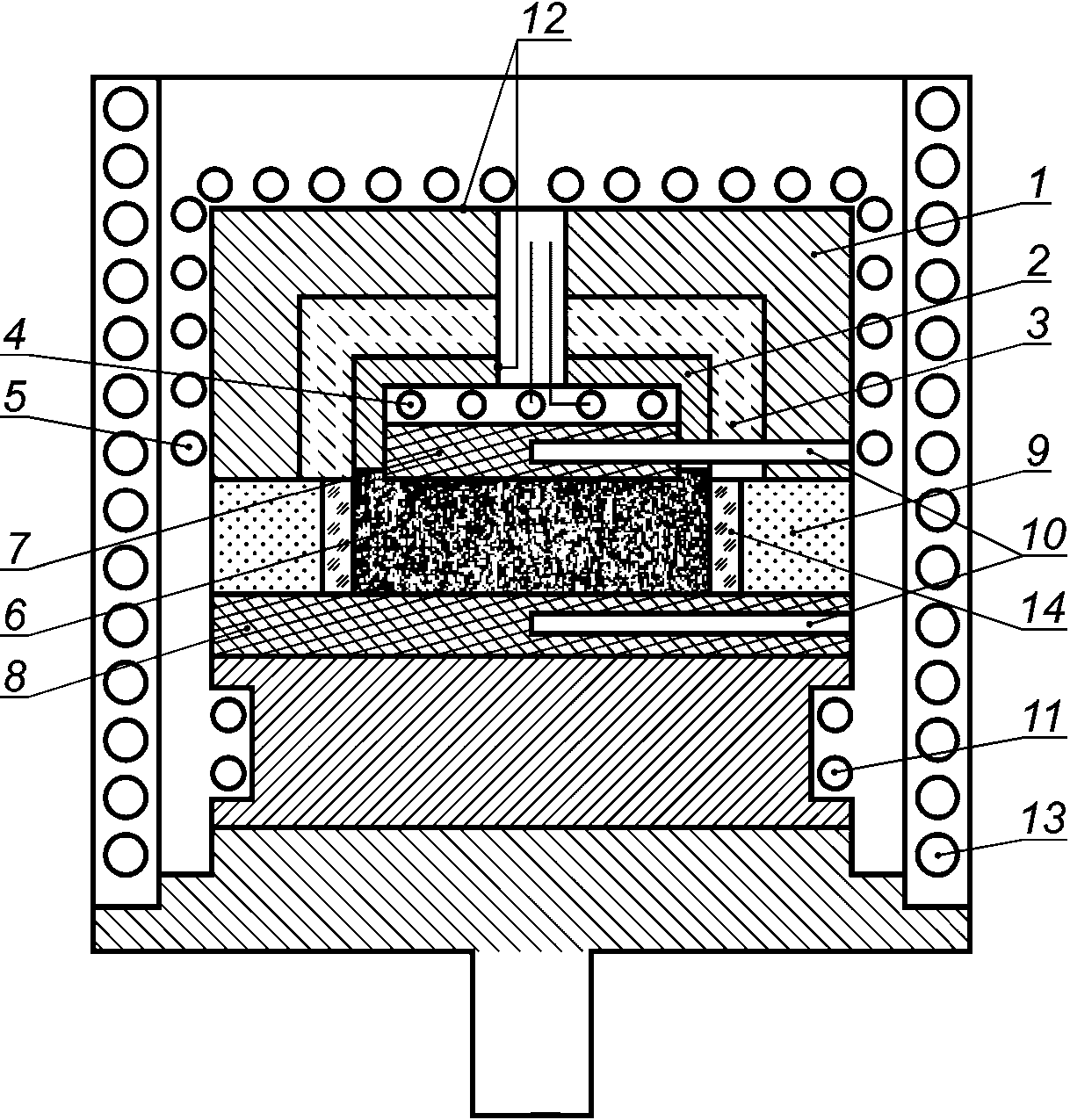 Экспериментальная установка состоит из двух цилиндриков - стаканов из нержавеющей стали 1, 2, между которыми запрессован слой тугоплавкого полупроводника - сульфида гадолиния 3. Они образуют высокотемпературную дифференциальную поверхностную термопару для контроля компенсации тепловых утечек с поверхности градиентного нагревателя 4, вмонтированного внутри меньшего стакана. Компенсационный нагреватель 5 намотан на поверхность внешнего стакана - второго электрода дифференциальной термопары, тщательно изолировав его от корпуса прибора. Образец исследуемого вещества 6 в виде таблетки диаметром, равным диаметру градиентного нагревателя - меньшего стакана, зажат между рабочими поверхностями прибора 7 и холодильника 8 и засыпан теплоизоляционным материалом - ультралегковесом 9 для уменьшения тепловых потерь с боковой поверхности. Перепад температуры на образце исследуемого материала измеряется двумя вольфрам-рениевыми термопарами 10. Регулировка градиента температуры на образце осуществляется высокоточным регулятором температуры РИФ 101 с помощью нагревателей 11, 13. При исследовании теплопроводности расплавов образец закладывается в кварцевое кольцо-контейнер 14. Выводы 12 от термоэлектродов поверхностной термопары подводятся к чувствительному гальванометру или потенциометру. Фиксируя с большой точностью (0,01 К) разность температур между поверхностями градиентного и компенсационного нагревателей и регулируя мощность компенсационного нагревателя, можно добиться нулевой разности температур между ними, что свидетельствует об отсутствии тепловых утечек с корпуса градиентного нагревателя.