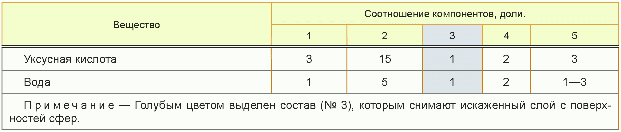 Искаженный слой снимают травлением с использованием травителей, разработанных для всех элементов шестой группы химических элементов таблицы Д.И. Менделеева (хром, молибден и вольфрам), см. таблицу 1. Для снятия искаженного слоя на поверхности сфер используют состав N 3. Скорость травления для равномерного стравливания выбирают ~ 0,8 мкм/мин и проводят встряхивания образцов в пробирке. Ввиду того, что окончание травления (полного снятия искаженного слоя) точно зафиксировать трудно, результаты обработки в кислотах проверяют рентгенографированием на дифрактометре как предварительный этап основного эксперимента.