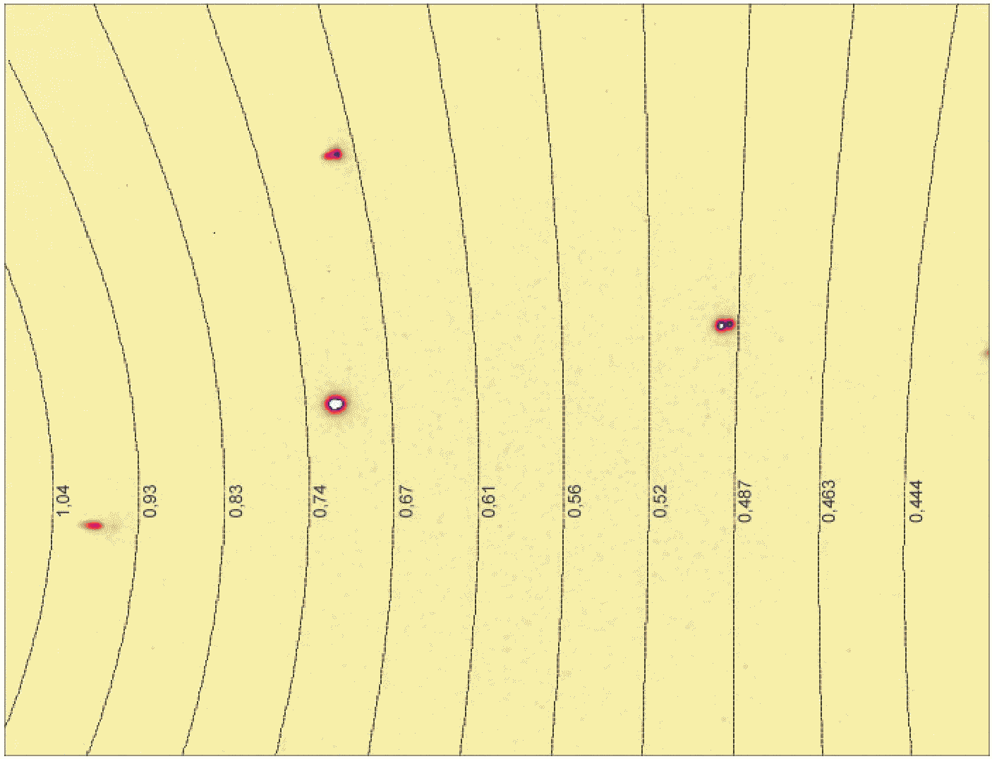 Для регистрации дифракционной картины устанавливают расстояние кристаллического детектора равным 41,5 мм, используя коллиматор с диаметром 0,5 мм. Устанавливают "Бункеровку" (объединение пикселей или разбиение матрицы на суб-блоки) 2 x 2, с разрешением матрицы детектора 1024 x 1024 пк. Для молибденового источника рентгеновского излучения устанавливают типовые значения напряжения и тока: 50 кВ и 40 мА или 33 кВ и 50 мА, когда требуется устранить отражения, соответствующие второй гармонике