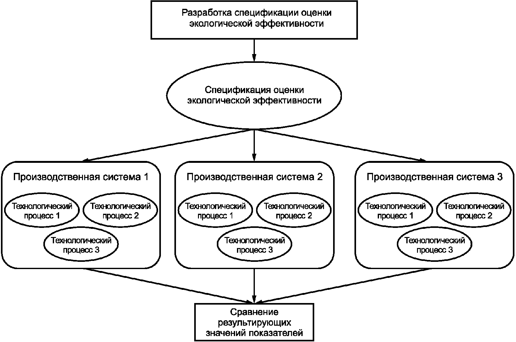 Рисунок A.1 иллюстрирует различные процедуры оценки экологической эффективности. Спецификации оценки экологической эффективности разрабатываются для различных производственных процессов. Результирующий целевой производственный процесс обеспечивается несколькими производственными системами. Каждый ключевой показатель экологической эффективности каждой производственной системы рассчитывается строго по формуле, прописанной в спецификации оценки экологической эффективности. По этой причине можно провести сравнение значений ключевых показателей экологической эффективности различных производственных систем.