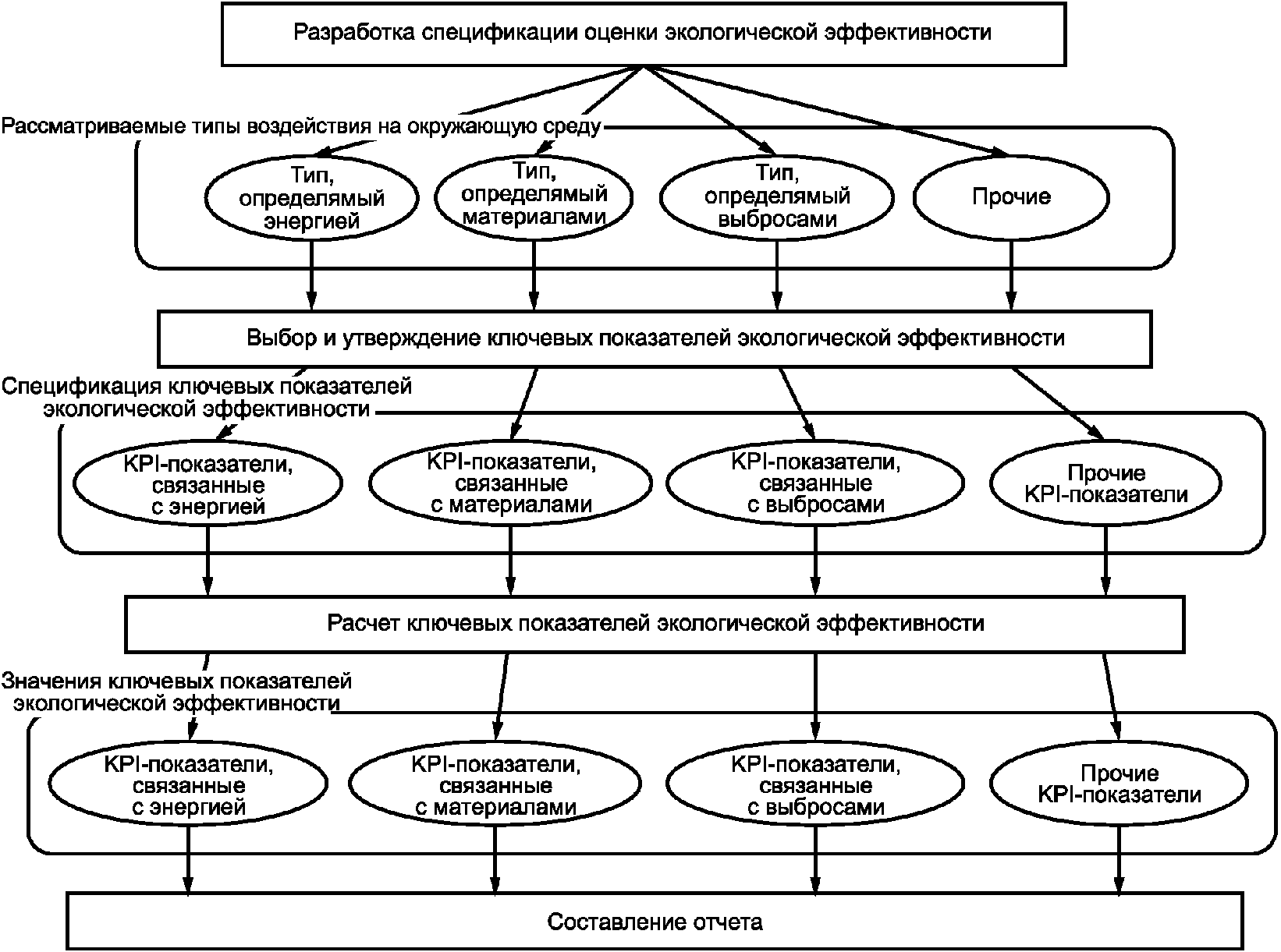 Процедура оценки экологической эффективности включает в себя разработку спецификации оценки экологической эффективности, выбор и утверждение системы ключевых показателей экологической эффективности, расчет ключевых показателей экологической эффективности, составление отчета о результатах оценки в соответствии с