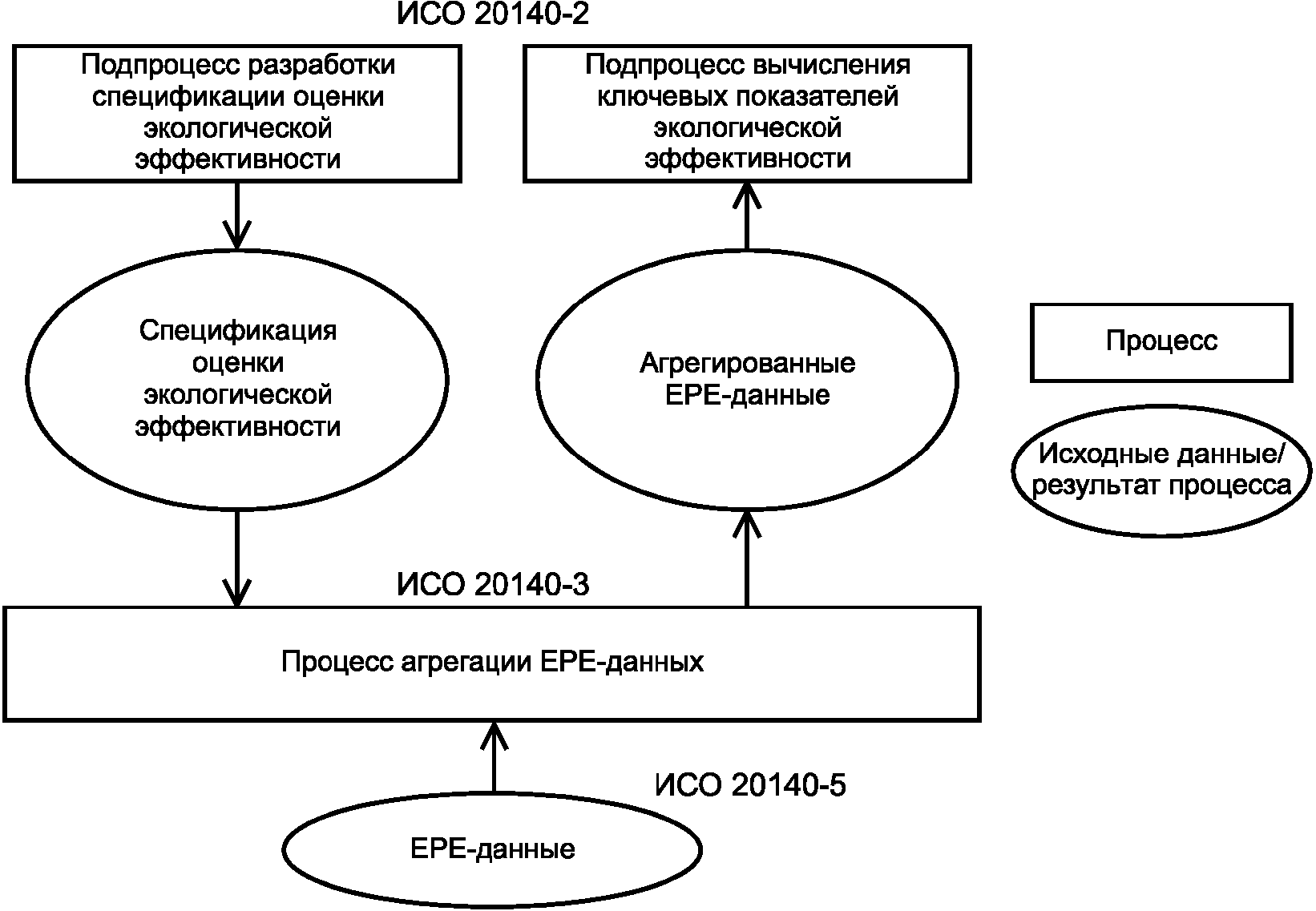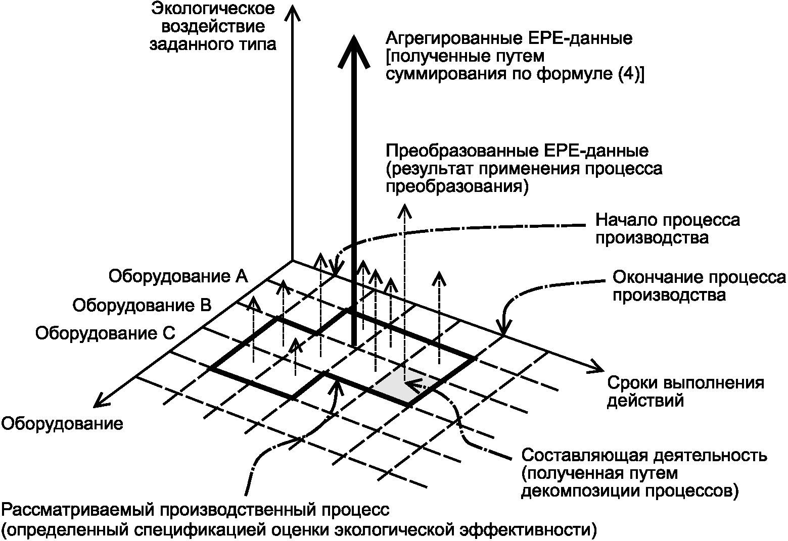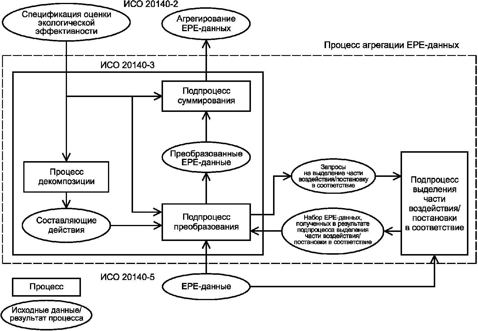 рисунок 3) представляет собой производственный процесс, определенный спецификацией оценки экологической эффективности как совокупность составляющих действий с надлежащей степенью детализации. При этом используемые агрегированные EPE-данные должны удовлетворять требованиям спецификации оценки экологической эффективности.
